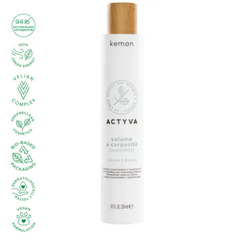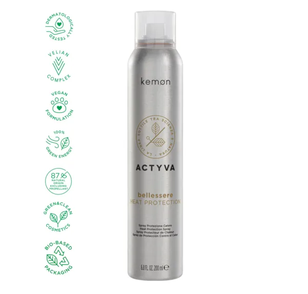 Kemon Actyva Bellessere Heat Protection Spray – це інноваційний, натуральний та екологічний засіб, що поєднує термозахист, ефект пам’яті укладання, м’якості та антифризовий контроль завдяки олії льону, аргановій олії та запатентованому Velian Complex. Рекомендований для повсякденного користування всім, хто прагне зберегти здоровий вигляд волосся при активному використанні нагрівальних інструментів.